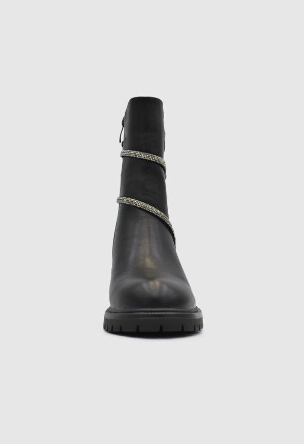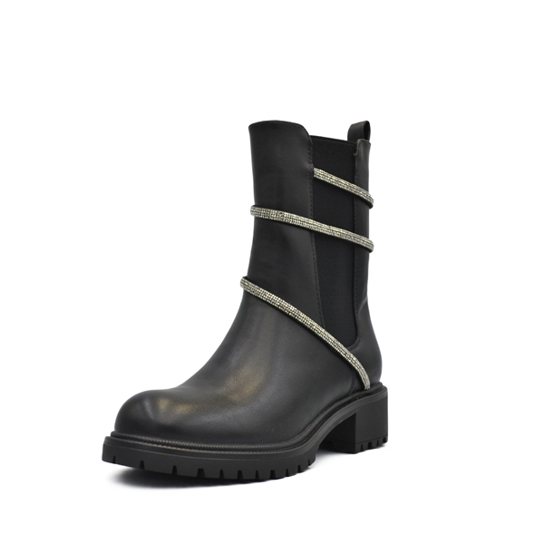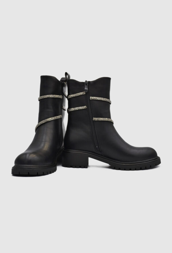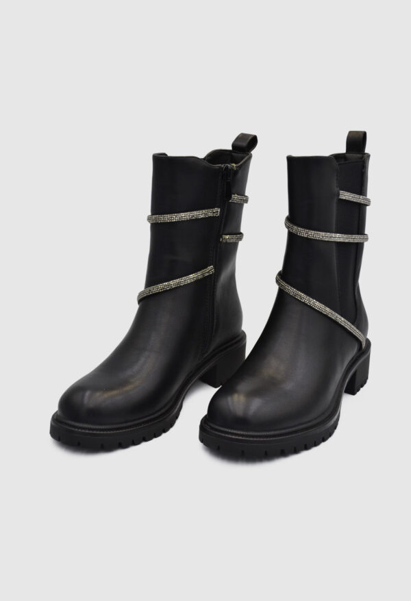 Μποτάκι δερματίνη με φερμουάρ στο πλάι και λεπτομέρειες strass και περιμετρικά του παπουτσιού. Άκρως εντυπωσιακό και άνετο θα γίνει αναμφισβήτητα η αγαπημένη σας επιλογή για κάθε εμφάνιση σας.